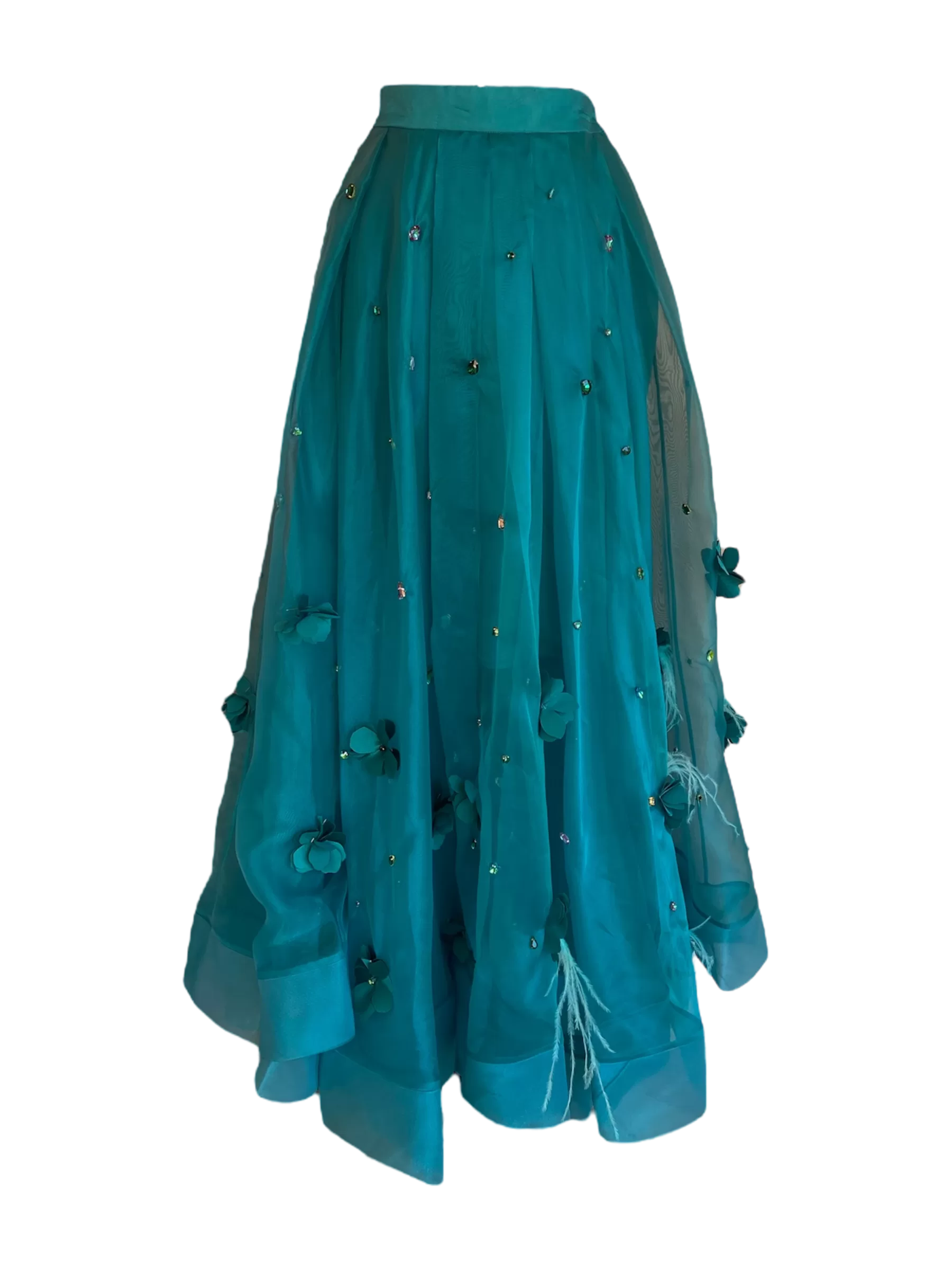 Falda bordada con flores y plumas.