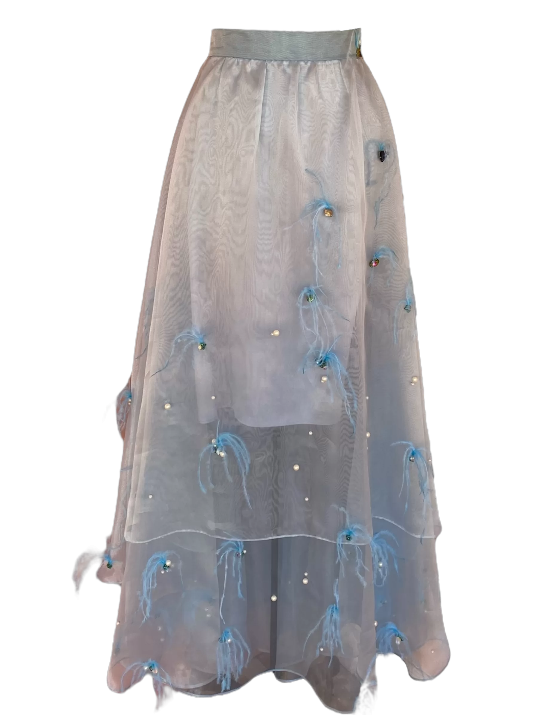 Falda bordada con pedreria y plumas.