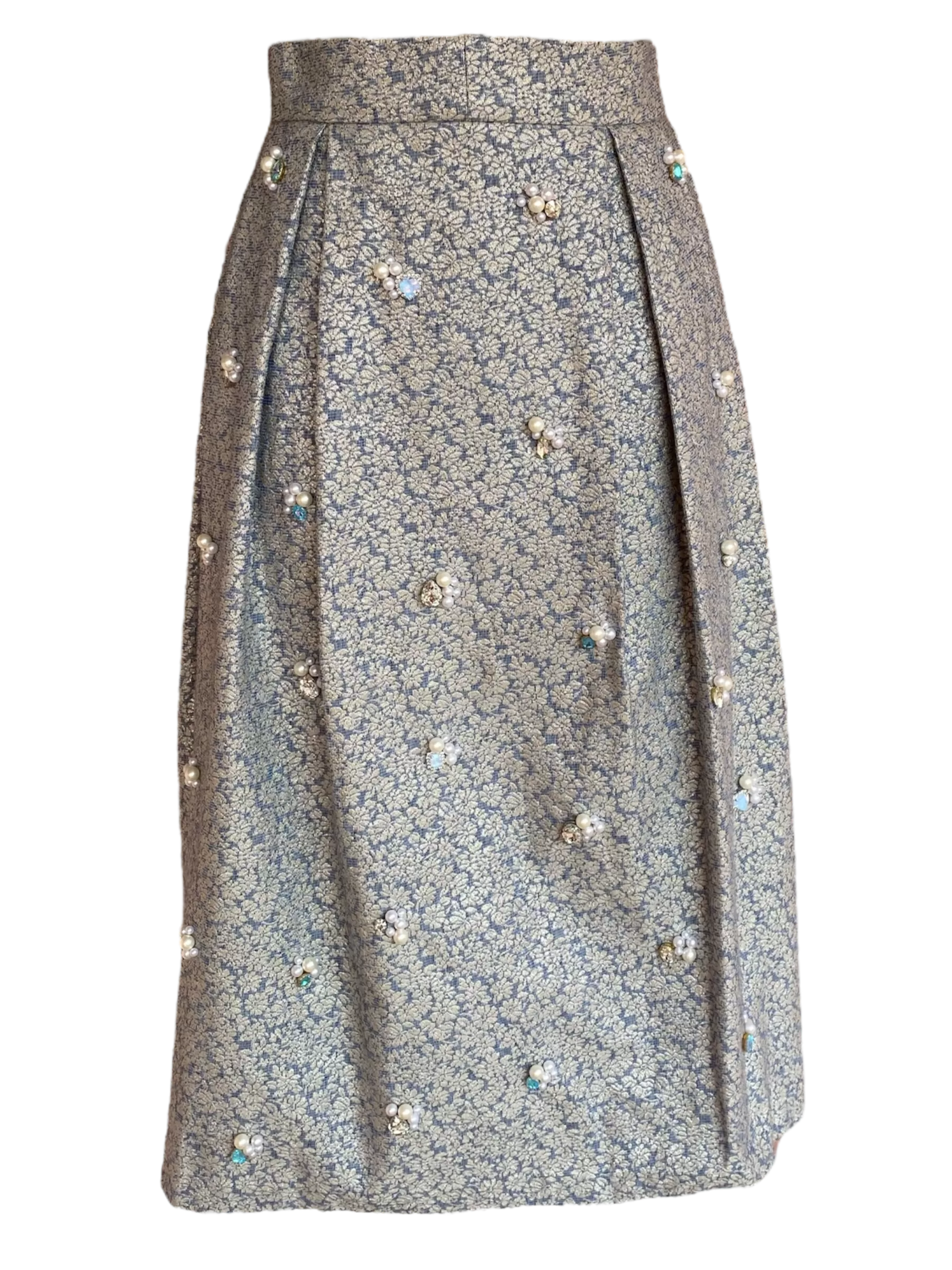 - Falda corte A de tela damasco con hilos metálicos que le dan un sutil toque a la tela con perlas y cristales bordados a mano.