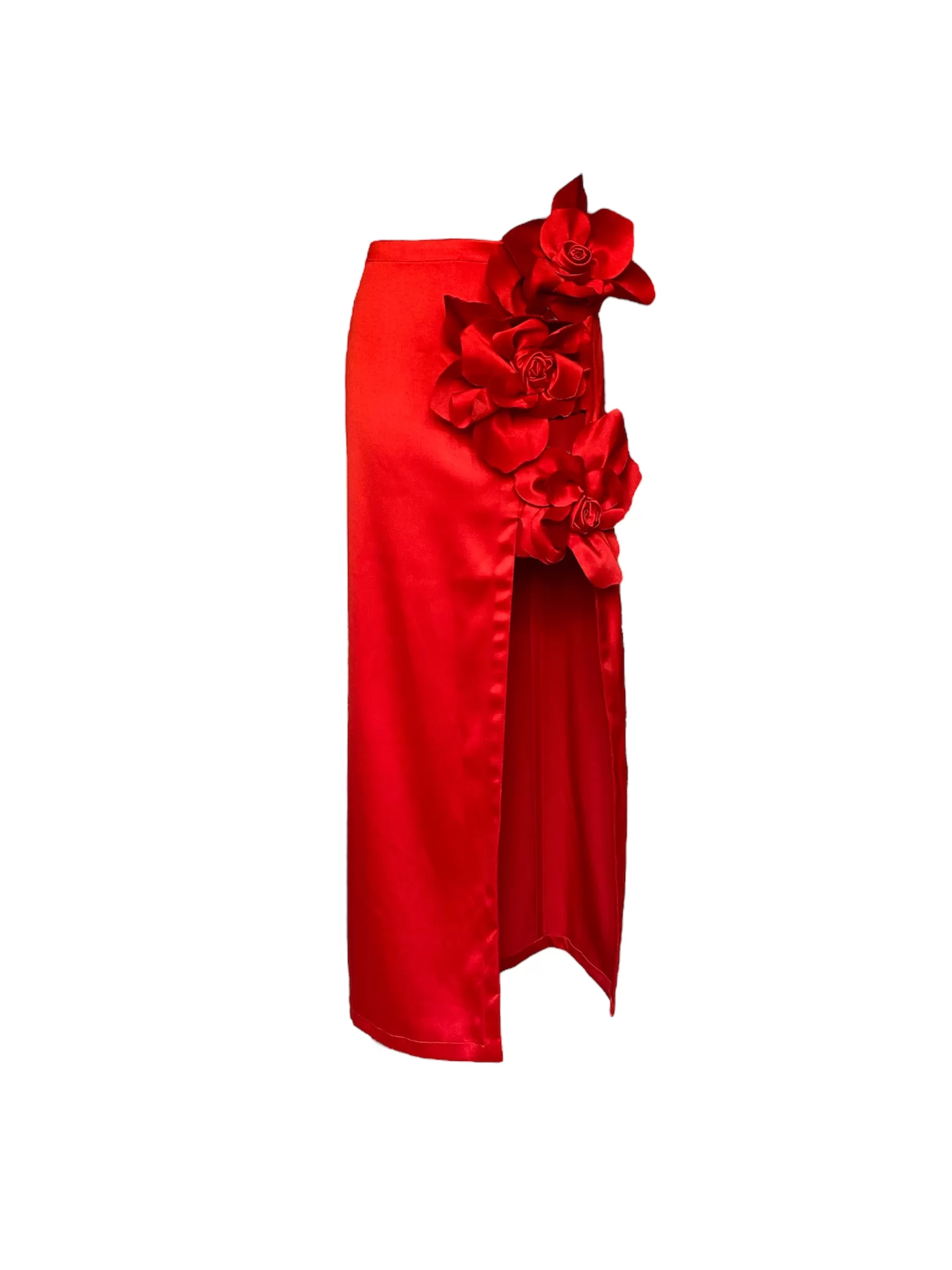 - Falda de Satin con detalle de flores en cadera, abertura en la pierna.