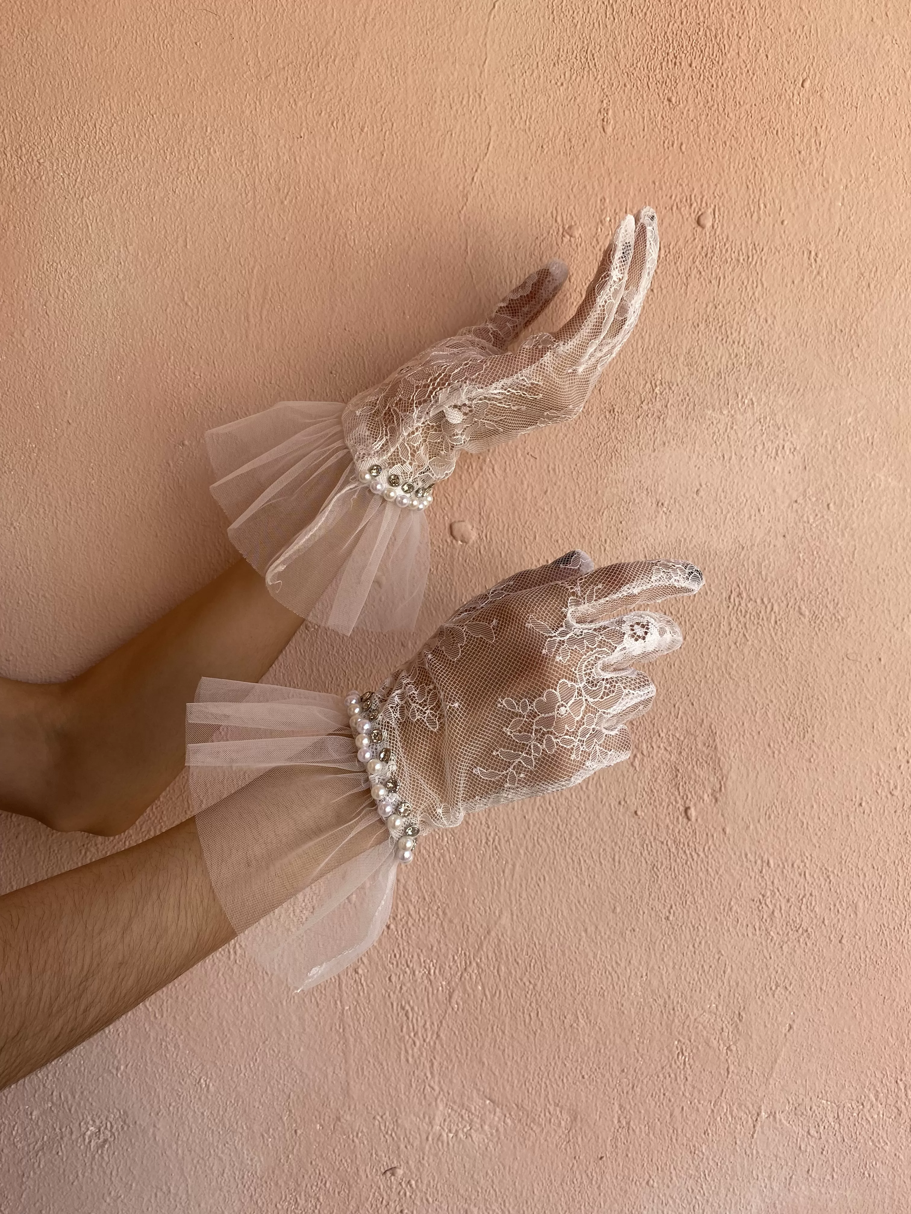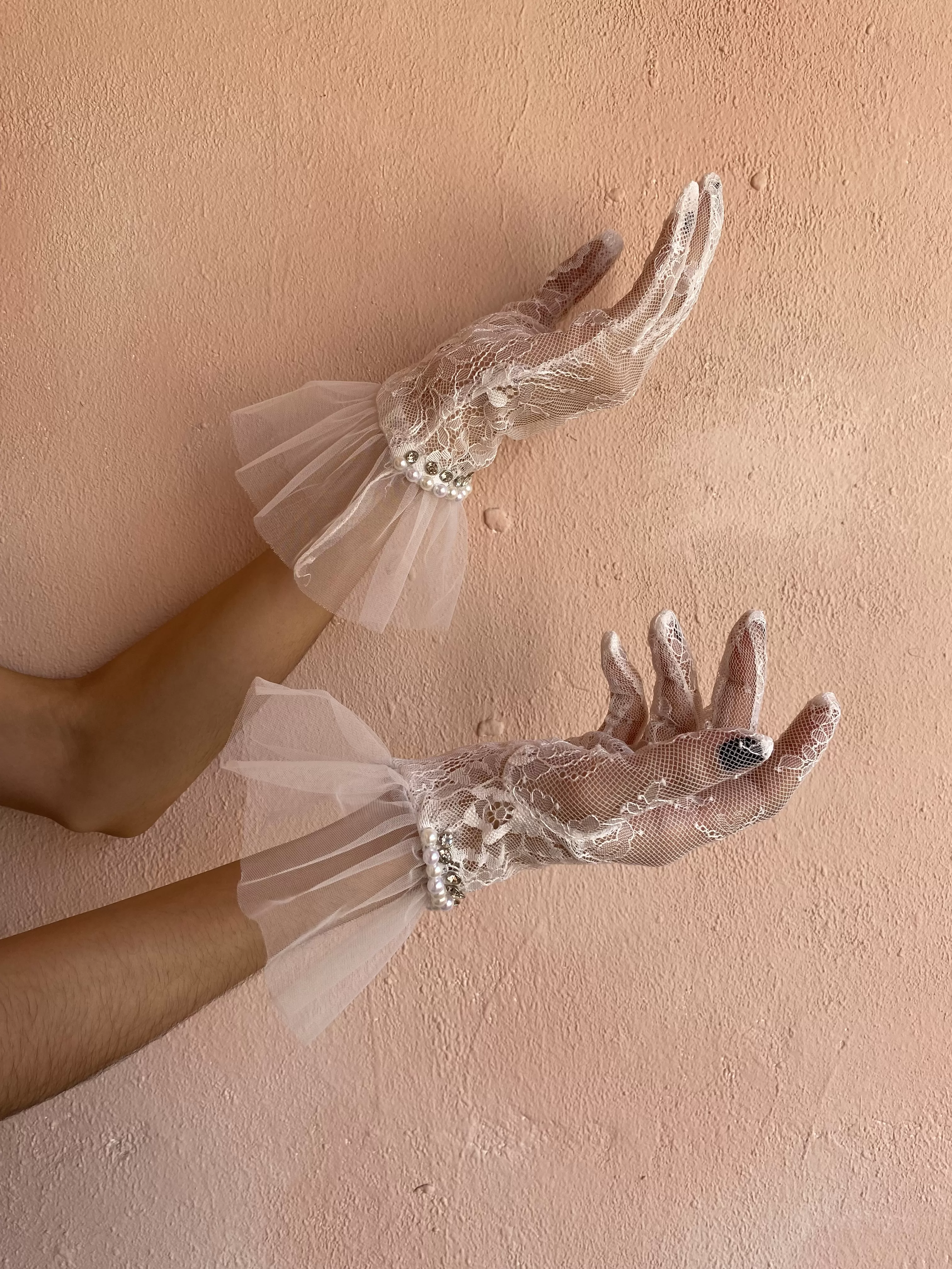 / Guantes de encaje con perlas, tul y pedreria