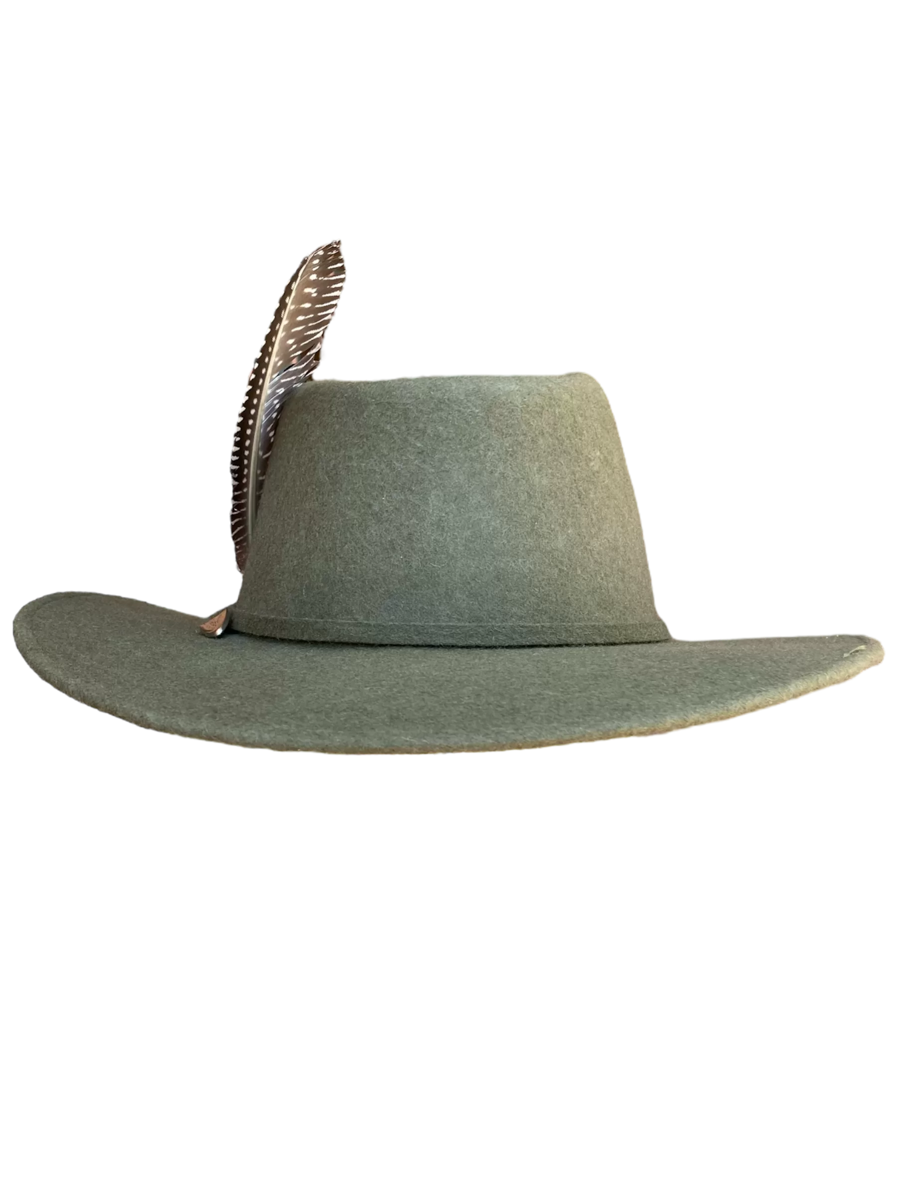 Sombrero estilo indy de gamuza con paleacate y detalle de pluma y carta.