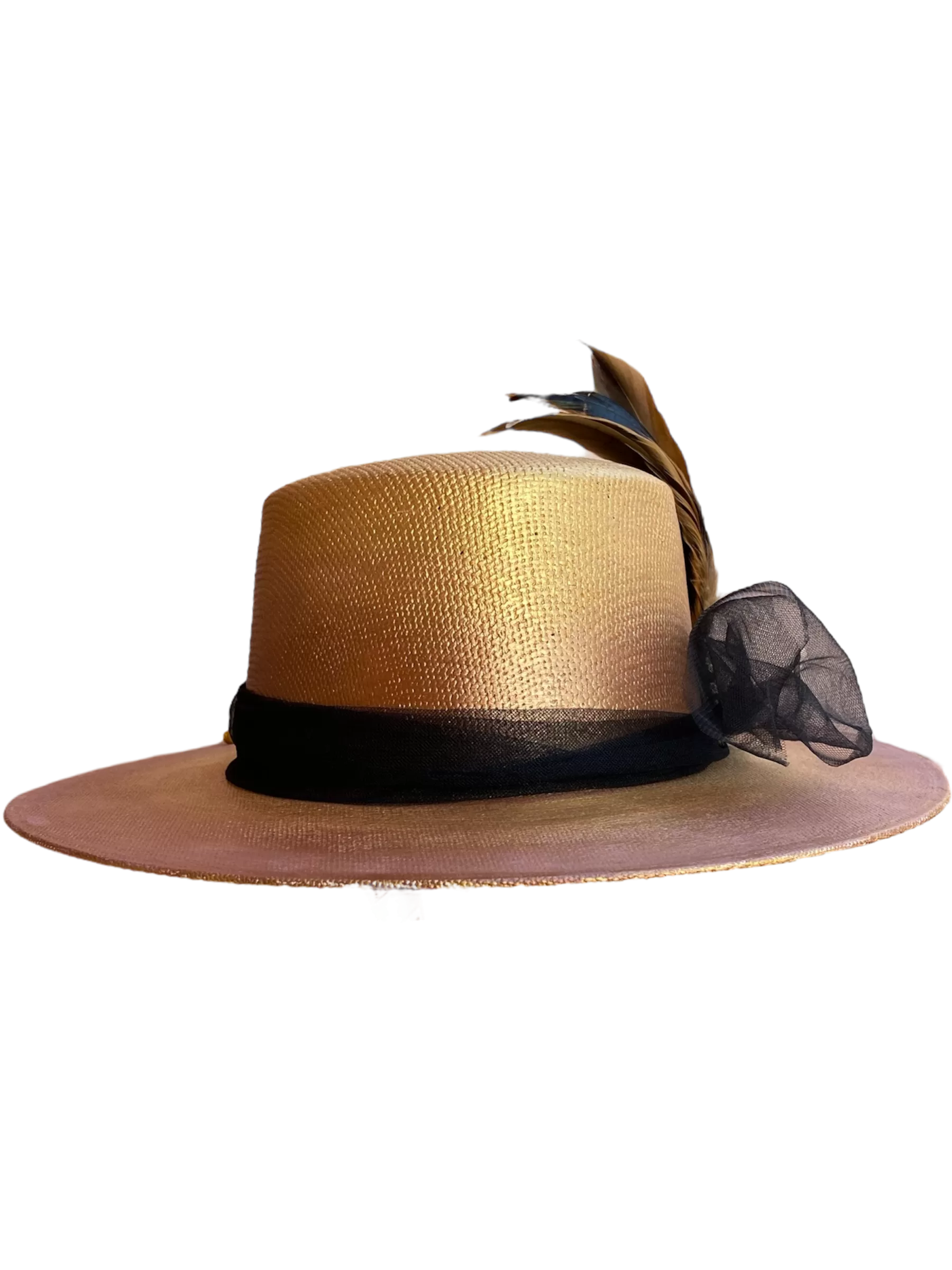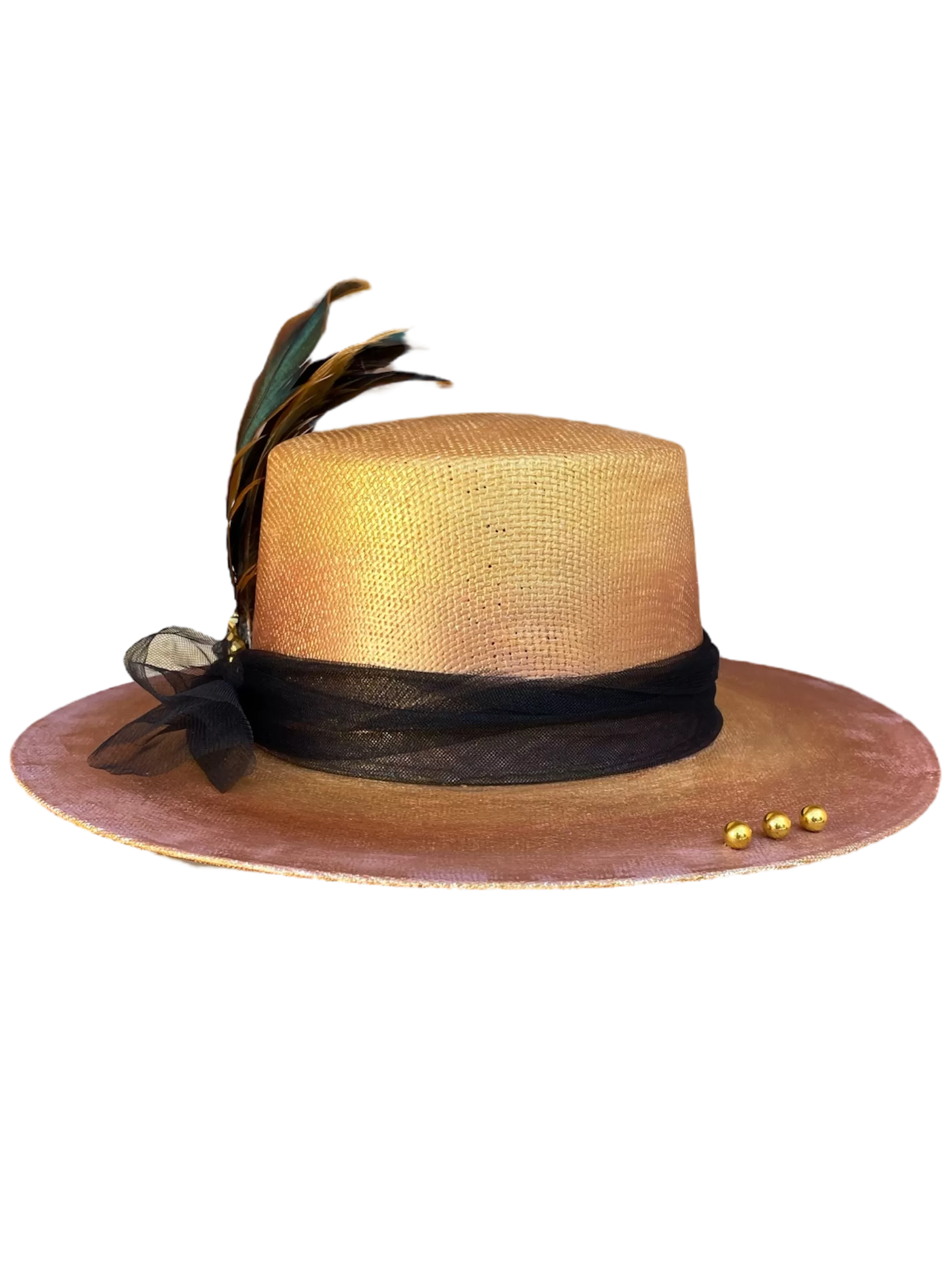 - Sombrero pintado a mano con Tul, pluma y ampliación dorada.